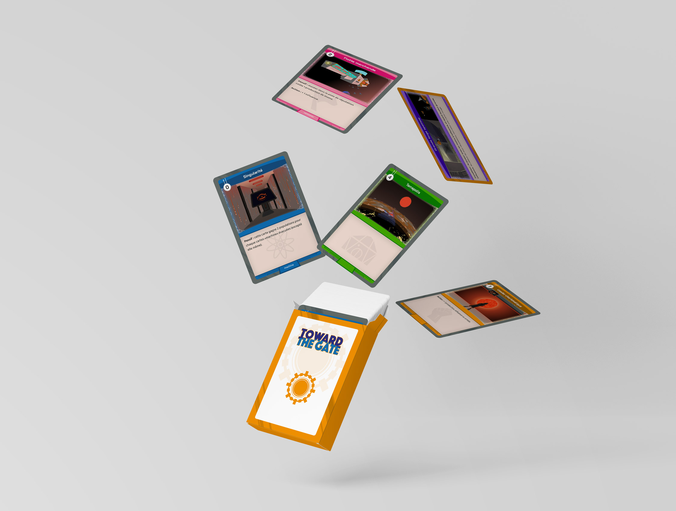 Toward The Gate est un jeu de cartes de mon invention, dans une thématique space-opéra : les joueurs incarnent des passeurs en compétition pour évacuer le plus de monde possible d'une galaxie mourante vers un univers plus jeune.